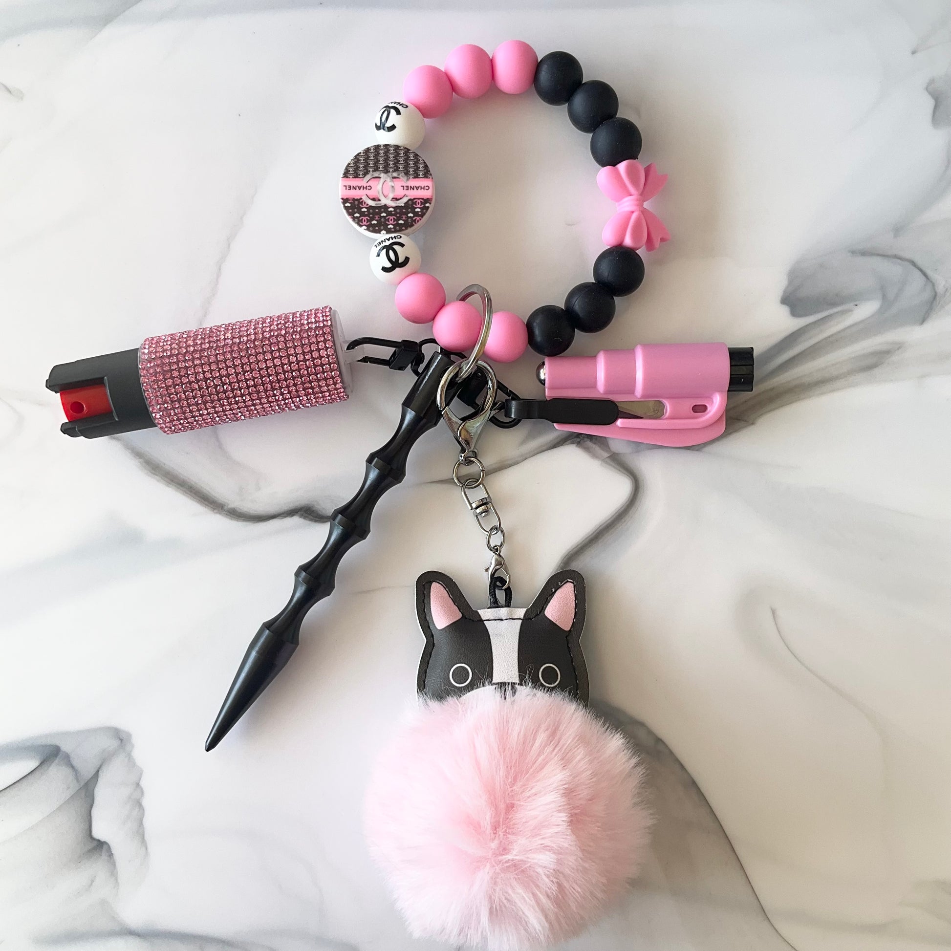 Make a bold statement while staying prepared with this Frenchie Chanel-Inspired Pink and Black Silicone Wristlet Self-Defense Keychain Set. This multifunctional set includes a bling pepper spray holder, a kubotan personal safety tool, and a window breaker/seat belt cutter tool for emergency situations. Lightweight yet sturdy, each piece clips securely to the wristlet so your essentials stay accessible when you need them most.