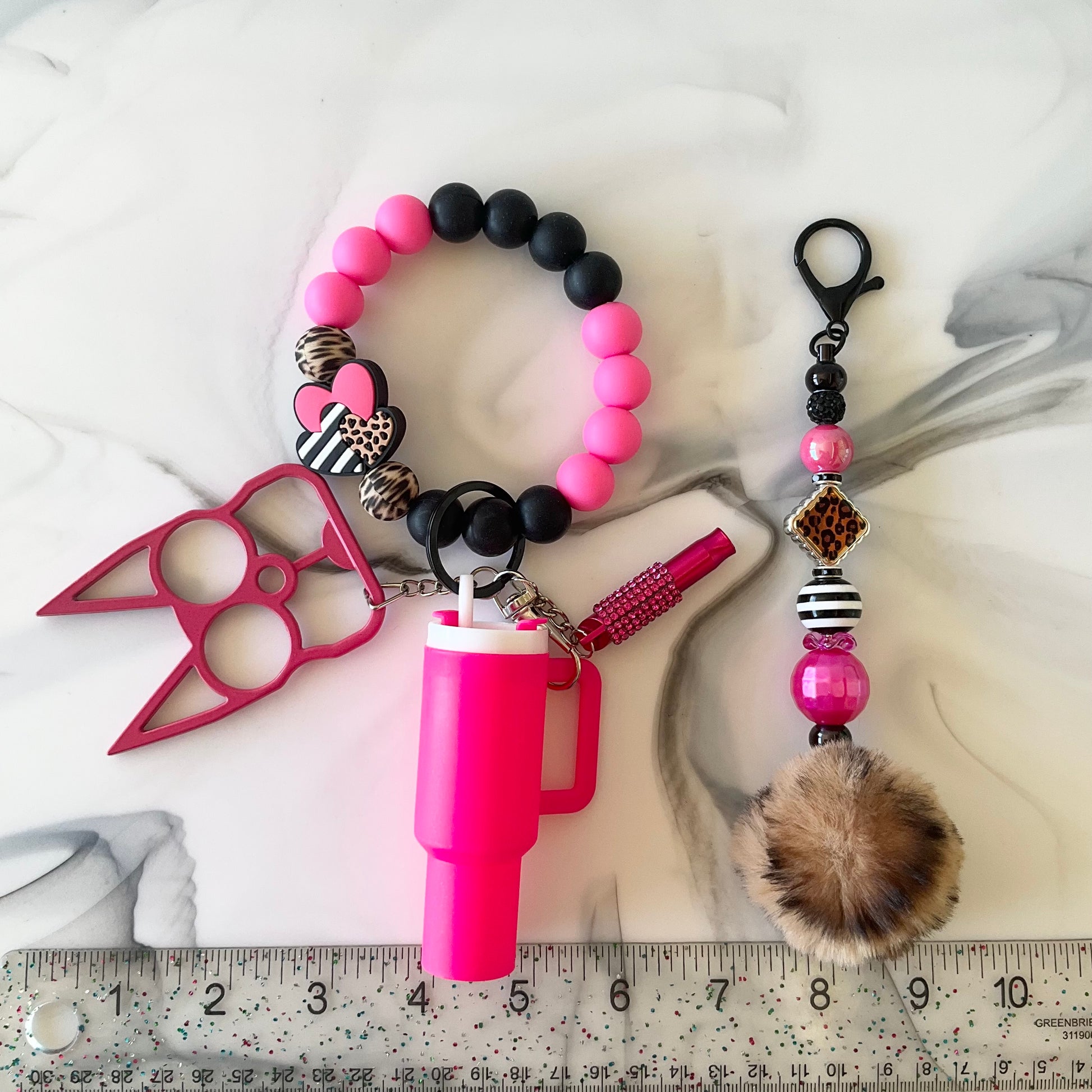 Stay stylish while keeping safety close at hand with this Hot Pink Leopard Print Silicone Wristlet Keychain Set. The set includes a matching mini tumbler keychain to keep small items close, a kitty shaped personal safety tool for personal security, and a rhinestone self-defense whistle to help draw attention when needed.
