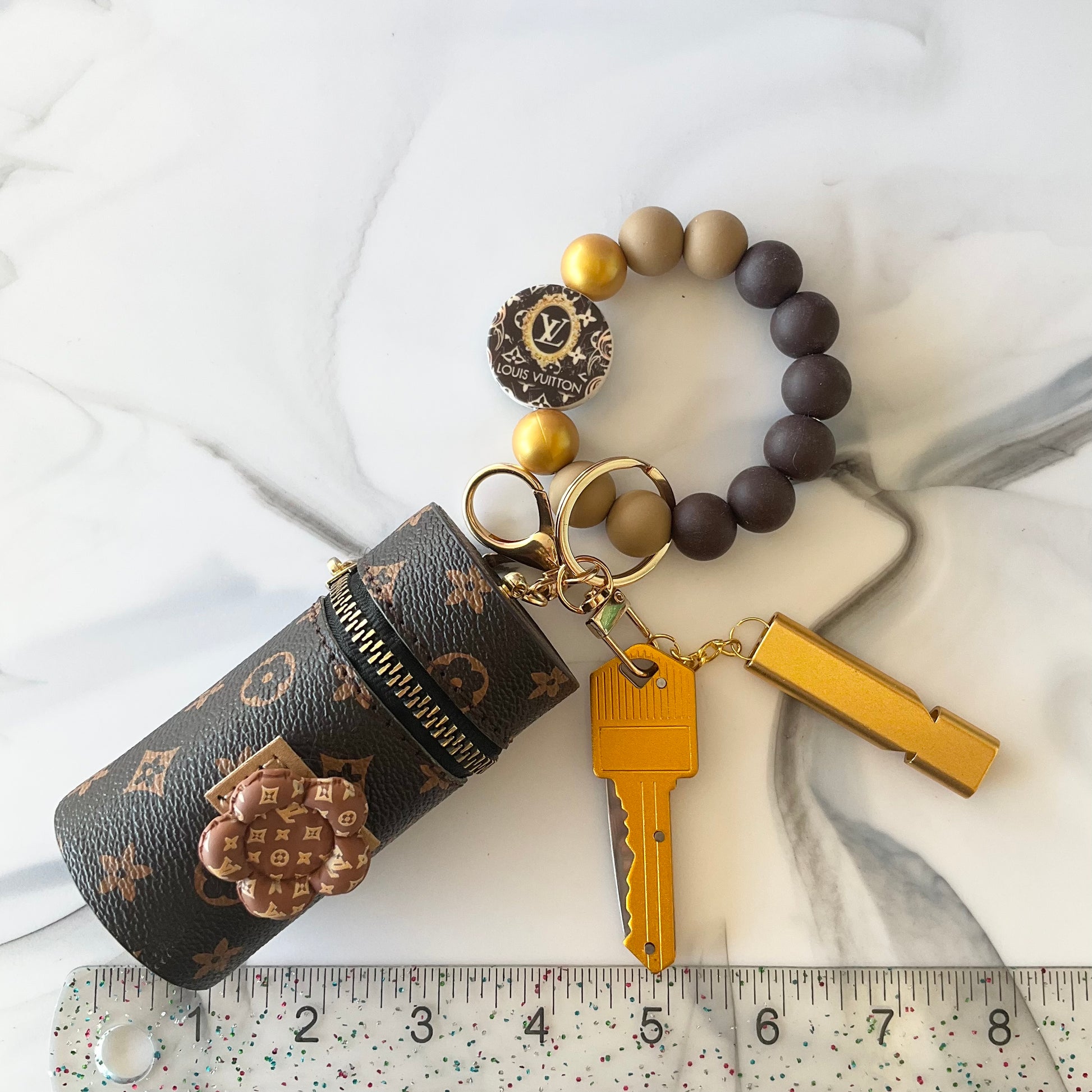 Elevate your everyday carry with this Brown and Gold Designer-Inspired Silicone Wristlet Keychain Set, featuring a luxe look with practical functionality. This multifunctional set includes a spacious lipstick case large enough to hold small essentials like lip balm, folded cash, or other tiny must-haves. It also features a key-shaped tool that opens into a small knife and a security whistle to help provide an added layer of preparedness when you’re out and about.